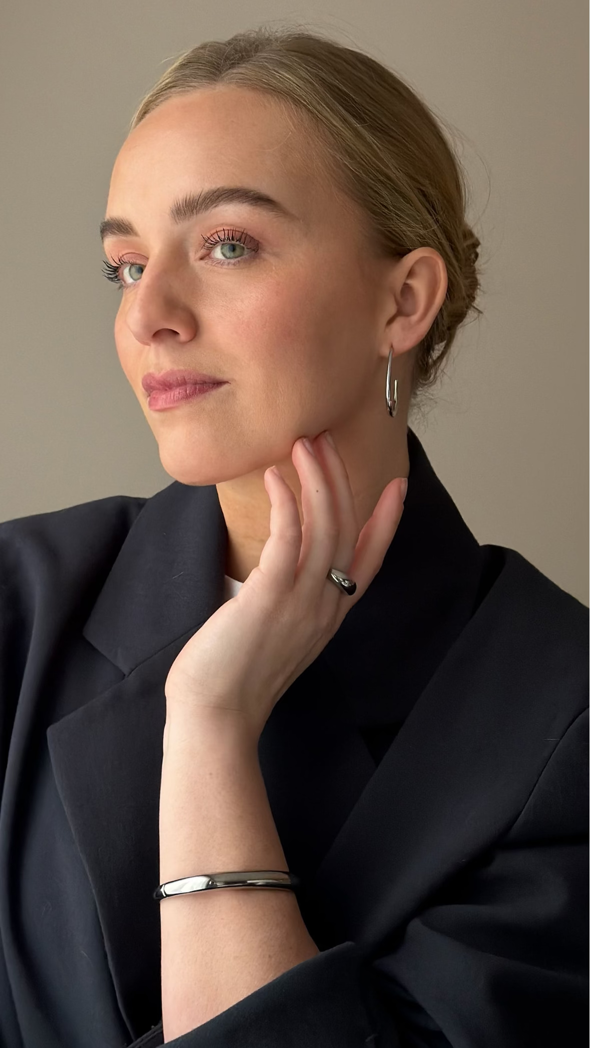 The Lara Bangle Silver combines soft curves with a modern edge. Its fluid shape and smooth finish create a refined statement of everyday elegance.